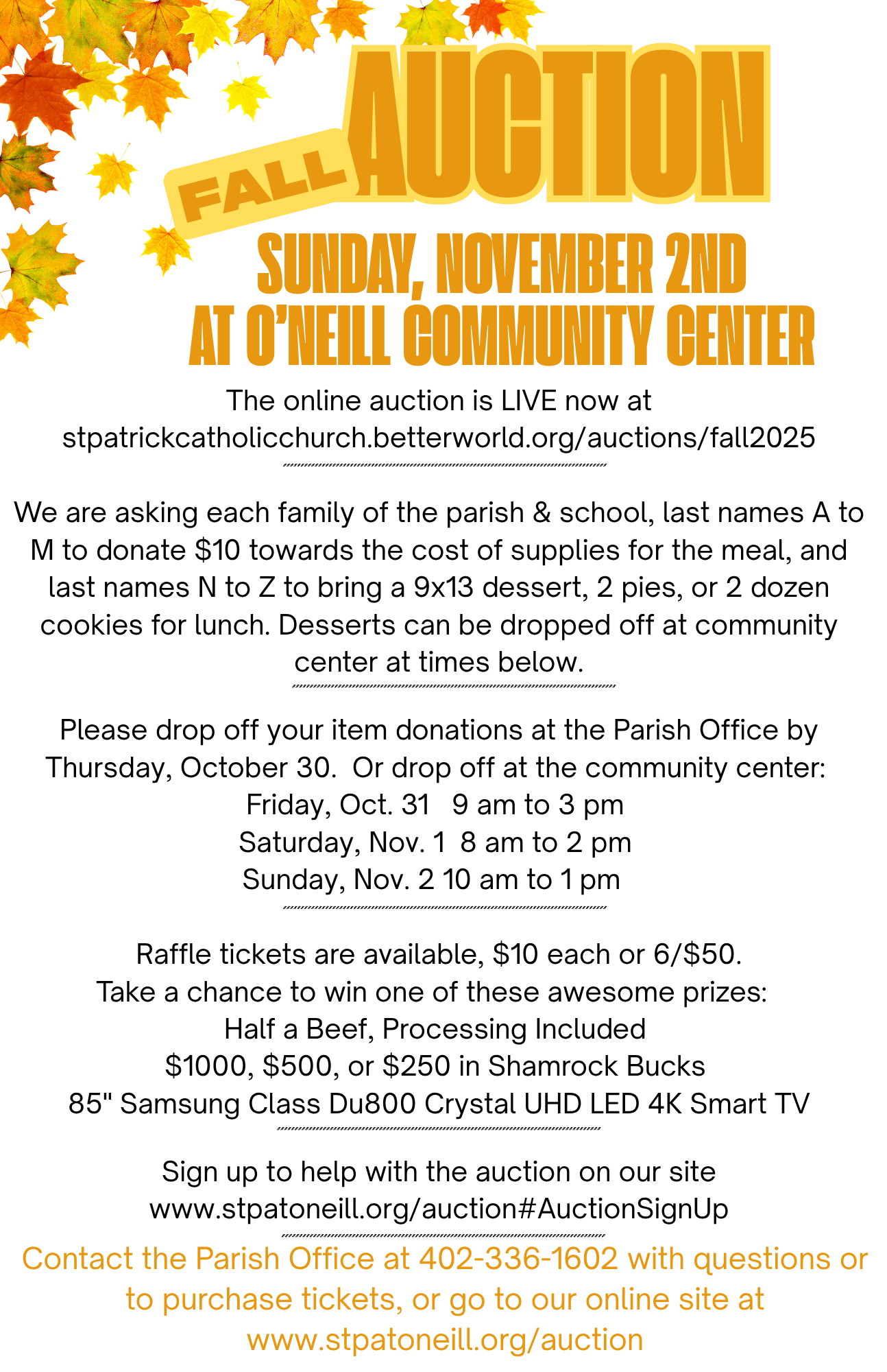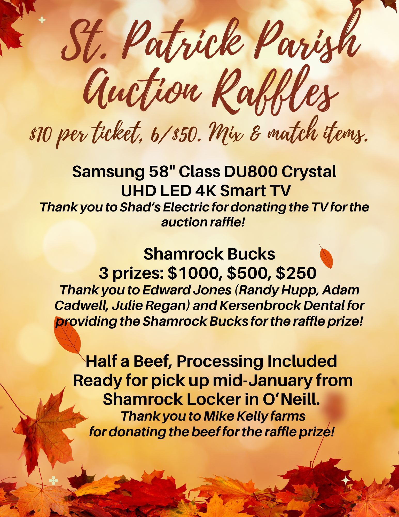 Contact the Parish Office at 402-336-1602 or stop by 313 E Hwy 20 to pick up your tickets!